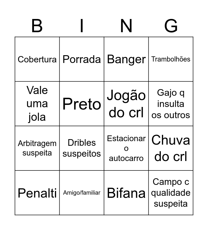 This bingo card has 16 words: Amigo/familiar, Chuva do crl, Banger, Cobertura, Arbitragem suspeita, Porrada, Estacionar o autocarro, Bifana, Vale uma jola, Preto, Penalti, Trambolhões, Dribles suspeitos, Gajo q insulta os outros, Jogão do crl and Campo c qualidade suspeita.