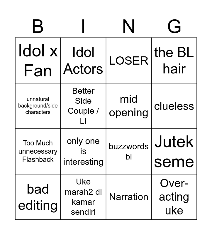 This bingo card has 16 words: Uke marah2 di kamar sendiri, Jutek seme, LOSER, Idol x Fan, Too Much unnecessary Flashback, Idol Actors, buzzwords bl, Narration, unnatural background/side characters, Better Side Couple / LI, bad editing, the BL hair, only one is interesting, clueless, mid opening and Over-acting uke.