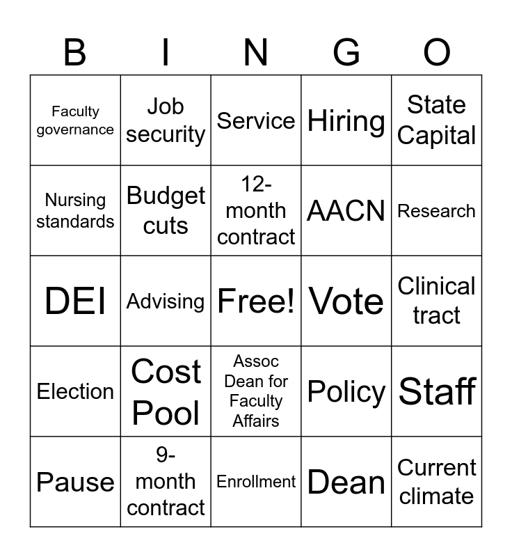 This bingo card has a free space and 29 words: Pause, Merit, Advising, Equity Minded Workload, Faculty governance, Service, Budget cuts, Cost Pool, Vote, 9-month contract, Clinical tract, Current climate, Enrollment, Dean, Research, Tenure/Tenure track, Assoc Dean for Faculty Affairs, Election, State Capital, DEI, Policy, Curriculum, AACN, Nursing standards, Hiring, Job security, Staff, 12-month contract and exceptional.