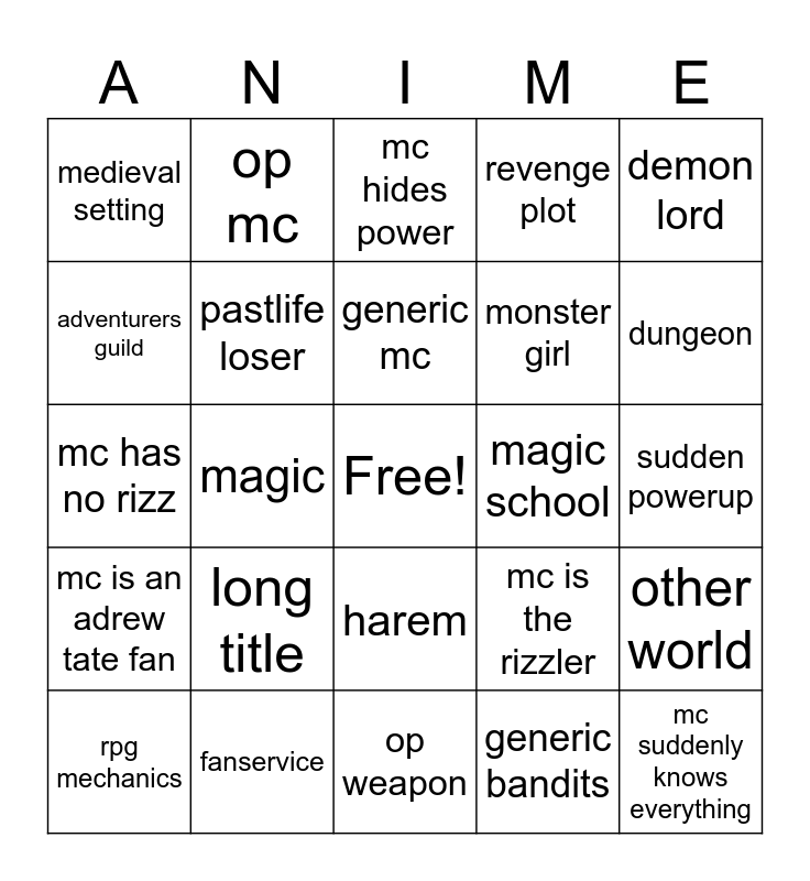 This bingo card has a free space and 24 words: long title, fanservice, generic mc, rpg mechanics, demon lord, medieval setting, adventurers guild, op mc, magic school, harem, monster girl, mc has no rizz, mc is the rizzler, other world, pastlife loser, generic bandits, sudden powerup, mc hides power, dungeon, magic, mc suddenly knows everything, mc is an adrew tate fan, revenge plot and op weapon.