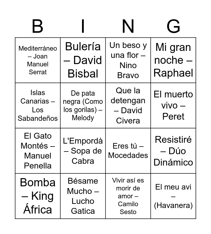 This bingo card has 51 words: Free!, Bomba – King África, Macarena – Los del Río, Aserejé – Las Ketchup, Mi carro – Manolo Escobar, Ave María – David Bisbal, Bulería – David Bisbal, Waka Waka – Shakira, De pata negra (Como los gorilas) – Melody, Maquillaje – Mecano, Que la detengan – David Civera, Mi gran noche – Raphael, Paquito el Chocolatero – Gustavo Pascual Falcó, El Rey – Vicente Fernández, Libre – Nino Bravo, En tu fiesta me colé – Mecano, El muerto vivo – Peret, Bésame Mucho – Lucho Gatica, La chica ye-ye – Concha Velasco, Islas Canarias – Los Sabandeños, Resistiré – Dúo Dinámico, Cielito Lindo – Mariachi Vargas, Mediterráneo – Joan Manuel Serrat, El Gato Montés – Manuel Penella, Quizás, Quizás, Quizás – Nat King Cole, Como una ola – Rocío Jurado, L'Empordà – Sopa de Cabra, La barbacoa – Georgie Dann, Francisco Alegre – Juanita Reina, Un beso y una flor – Nino Bravo, Si nos dejan – Luis Miguel, Bamboleo – Gipsy Kings, Paraules d'amor – Joan Manuel Serrat, España Cañí – Pascual Marquina, Eva María – Fórmula V, Solamente una vez – Agustín Lara, Amigos para siempre – Los Manolos, Suspiros de España – Antonio Álvarez Alonso, Boig per tu – Sau, Perfidia – Los Panchos, Vivir así es morir de amor – Camilo Sesto, El meu avi – (Havanera), Adelita – (Ranxera popular), Bailar pegados – Sergio Dalma, Borriquito – Peret, En Er Mundo – (Pasodoble), Eres tú – Mocedades, Valencia – Jorge Negrete, Marinero de luces – Isabel Pantoja, Cuéntame – Fórmula V and La Santa Espina – (Sardana).