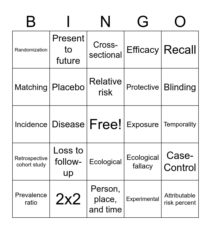 Epidemiology Bingo | Epi Quiz #2 Bingo | Epidemiology in Practice BINGO | NS 3600 Bingo: Intro Epi Terms | SICKO