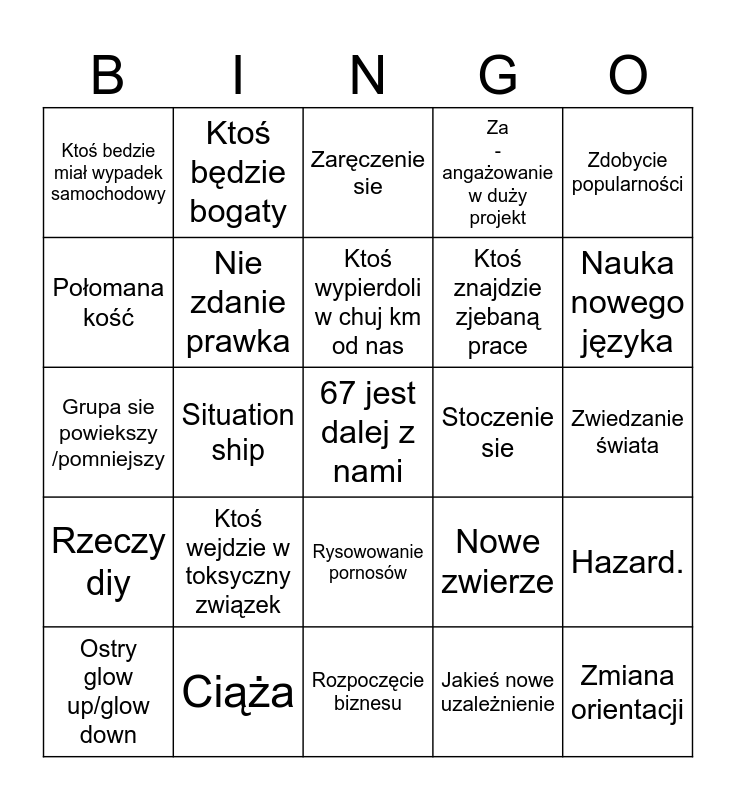 This bingo card has a free space and 24 words: Ktoś wejdzie w toksyczny związek, Ciąża, Ktoś wypierdoli w chuj km od nas, Ostry glow up/glow down, Zdobycie popularności, Ktoś bedzie miał wypadek samochodowy, Połomana kość, Ktoś będzie bogaty, Stoczenie sie, Rysowowanie pornosów, Ktoś znajdzie zjebaną prace, Grupa sie powiekszy /pomniejszy, Nowe zwierze, Hazard., Nie zdanie prawka, Jakieś nowe uzależnienie, Zwiedzanie świata, Zaręczenie sie, Nauka nowego języka, Situation ship, Zmiana orientacji, Rzeczy diy, Za -angażowanie w duży projekt and Rozpoczęcie biznesu.