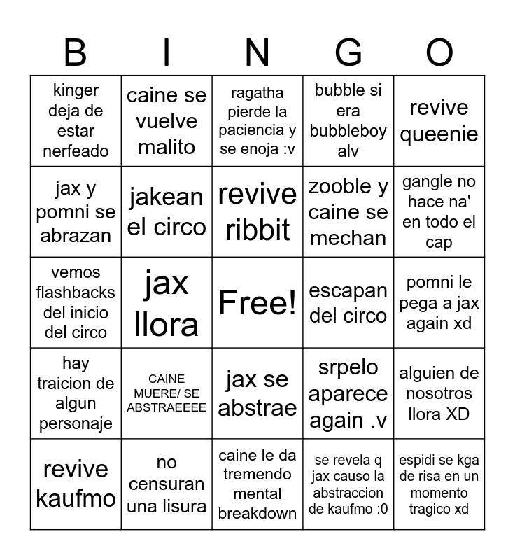 This bingo card has a free space and 24 words: CAINE MUERE/ SE ABSTRAEEEE, no censuran una lisura, revive ribbit, revive kaufmo, revive queenie, kinger deja de estar nerfeado, jax y pomni se abrazan, caine se vuelve malito, escapan del circo, jax se abstrae, zooble y caine se mechan, vemos flashbacks del inicio del circo, srpelo aparece again .v, alguien de nosotros llora XD, jakean el circo, se revela q jax causo la abstraccion de kaufmo :0, pomni le pega a jax again xd, ragatha pierde la paciencia y se enoja :v, gangle no hace na' en todo el cap, jax llora, espidi se kga de risa en un momento tragico xd, hay traicion de algun personaje, bubble si era bubbleboy alv and caine le da tremendo mental breakdown.