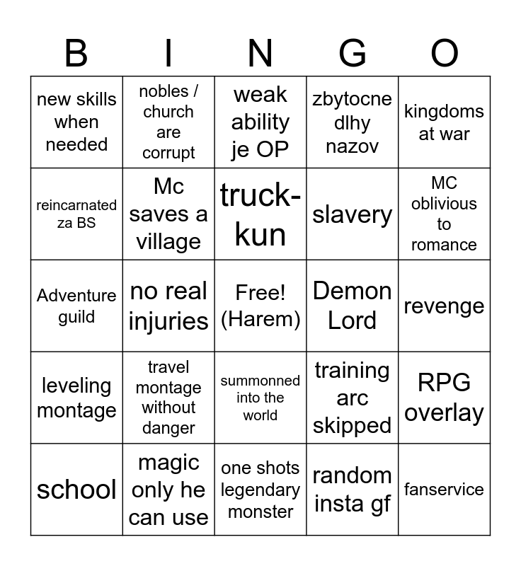 This bingo card has a free space and 28 words: RPG overlay, Loli, slavery, random insta gf, reincarnated za BS, weak ability je OP, nobles / church are corrupt, leveling montage, Demon Lord, school, Adventure guild, zbytocne dlhy nazov, magic only he can use, one shots legendary monster, MC oblivious to romance, villain explains evil plan, travel montage without danger, Mc saves a village, truck-kun, summonned into the world, new skills when needed, rare items for free, fanservice, no real injuries, revenge, training arc skipped, kingdoms at war and someone sneaks into MCs bed.
