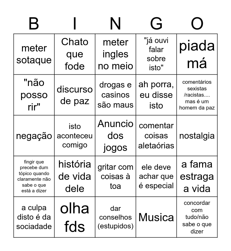 This bingo card has a free space and 37 words: filosofo atrasado, "eia", uabo supreso com algo obvio, discurso de paz, a fama estraga a vida, história de vida dele, drogas e casinos são maus, isto é ia, piada má, riso nervoso, isto aconteceu comigo, "já ouvi falar sobre isto", concordar com tudo/não sabe o que dizer, nostalgia, "não posso rir", fingir que precebe dum tópico quando claramente não sabe o que está a dizer, 2 vezes mano em 10 segundos, meter ingles no meio, gritar com coisas à toa, comentar coisas aletaórias, meter sotaque, comentários sexistas /racistas.... mas é um homem da paz, a culpa disto é da sociadade, dar conselhos (estupidos), LAG, Musica, Chato que fode, ninguem perguntou, é muito triste (obvio caralho), passou dos limites, este gajo é só estupido, olha fds, negação, boa frase (pa quem gosta de merda), ele deve achar que é especial, ah porra, eu disse isto and está na hora de fechar o video.