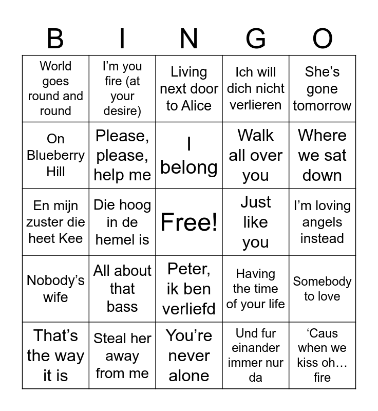 This bingo card has a free space and 42 words: Ahoeoeoe aweem away, I belong, Dan wel met jou, All about that bass, Und fur einander immer nur da, Somebody to love, ‘Caus when we kiss oh…fire, Baila, baila, baila, baila, Living next door to Alice, Peter, ik ben verliefd, I’m loving angels instead, Where we sat down, Die hoog in de hemel is, She’s gone tomorrow, Van jou en mij is echt, Having the time of your life, Waar is ie gebleven, die tijd, En mijn zuster die heet Kee, Jao, het mag wel zo, I’m you fire (at your desire), On Blueberry Hill, Take me dancing tonight, En was de schrik der zee, World goes round and round, Een oceaan vol tranen is van mij, But lay off of my blue suede shoes, Walk all over you, In the air, Never walk alone, Where is the love, I’m the great pretender, Nobody’s wife, Please, please, help me, You’re never alone, Ik ben er zelf eens door gered, That’s the way it is, Steal her away from me, Just like you, Hoe zijn we hier beland, Kom vanavond bij mij, Ich will dich nicht verlieren and Was ich habe auf der welt.