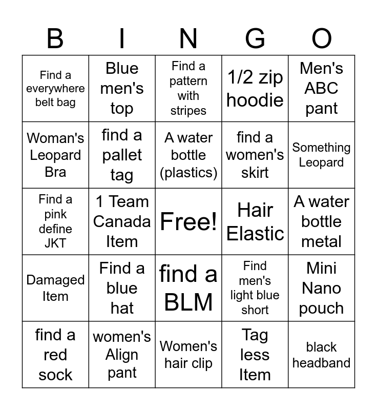 This bingo card has a free space and 24 words: Find a blue hat, women's Align pant, A water bottle (plastics), find a red sock, Men's ABC pant, Find a everywhere belt bag, Woman's Leopard Bra, Blue men's top, Hair Elastic, find a BLM, find a women's skirt, Find a pink define JKT, Find men's light blue short, Mini Nano pouch, find a pallet tag, Tag less Item, A water bottle metal, Find a pattern with stripes, Something Leopard, 1 Team Canada Item, black headband, Damaged Item, 1/2 zip hoodie and Women's hair clip.