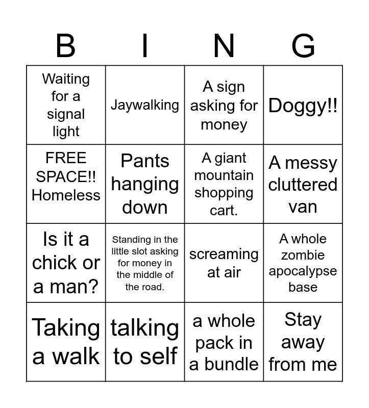 This bingo card has 16 words: talking to self, A whole zombie apocalypse base, A sign asking for money, Waiting for a signal light, Is it a chick or a man?, Jaywalking, screaming at air, a whole pack in a bundle, FREE SPACE!! Homeless, Pants hanging down, Taking a walk, Doggy!!, Standing in the little slot asking for money in the middle of the road., A messy cluttered van, A giant mountain shopping cart. and Stay away from me.