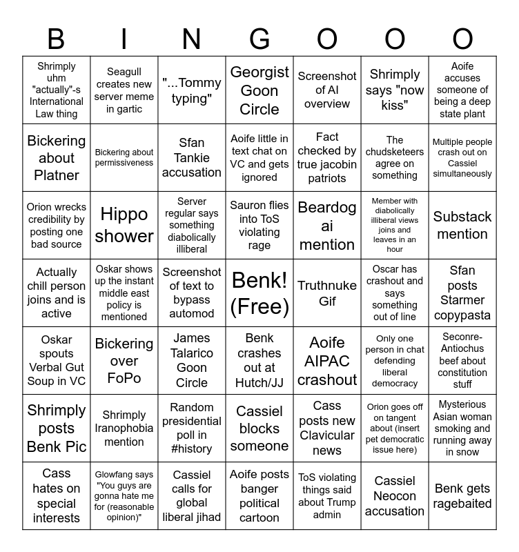 This bingo card has a free space and 48 words: Cass posts new Clavicular news, The chudsketeers agree on something, Aoife posts banger political cartoon, Oskar shows up the instant middle east policy is mentioned, Server regular says something diabolically illiberal, Sfan posts Starmer copypasta, Seagull creates new server meme in gartic, Glowfang says "You guys are gonna hate me for (reasonable opinion)", Shrimply says "now kiss", Benk crashes out at Hutch/JJ, Aoife accuses someone of being a deep state plant, Georgist Goon Circle, Member with diabolically illiberal views joins and leaves in an hour, Beardog ai mention, Shrimply posts Benk Pic, Oscar has crashout and says something out of line, Bickering about Platner, Multiple people crash out on Cassiel simultaneously, Orion goes off on tangent about (insert pet democratic issue here), Screenshot of AI overview, Fact checked by true jacobin patriots, Screenshot of text to bypass automod, Shrimply uhm "actually"-s International Law thing, Bickering about permissiveness, Mysterious Asian woman smoking and running away in snow, Sfan Tankie accusation, Substack mention, Cass hates on special interests, Sauron flies into ToS violating rage, Hippo shower, Cassiel Neocon accusation, Truthnuke Gif, Seconre-Antiochus beef about constitution stuff, Shrimply Iranophobia mention, Actually chill person joins and is active, Aoife AIPAC crashout, Only one person in chat defending liberal democracy, Orion wrecks credibility by posting one bad source, James Talarico Goon Circle, Random presidential poll in #history, Oskar spouts Verbal Gut Soup in VC, Benk gets ragebaited, "...Tommy typing", Cassiel calls for global liberal jihad, Aoife little in text chat on VC and gets ignored, Cassiel blocks someone, Bickering over FoPo and ToS violating things said about Trump admin.