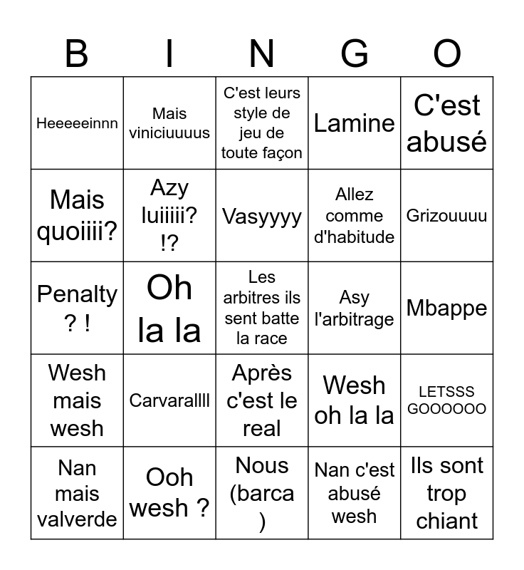 This bingo card has a free space and 24 words: Carvarallll, Ooh wesh ?, Vasyyyy, Nan mais valverde, C'est abusé, Heeeeeinnn, Mais quoiiii?, Mais viniciuuuus, Asy l'arbitrage, Après c'est le real, Allez comme d'habitude, Penalty ? !, Wesh oh la la, LETSSS GOOOOOO, Azy luiiiii? !?, Nan c'est abusé wesh, Mbappe, C'est leurs style de jeu de toute façon, Grizouuuu, Oh la la, Ils sont trop chiant, Wesh mais wesh, Lamine and Nous (barca ).