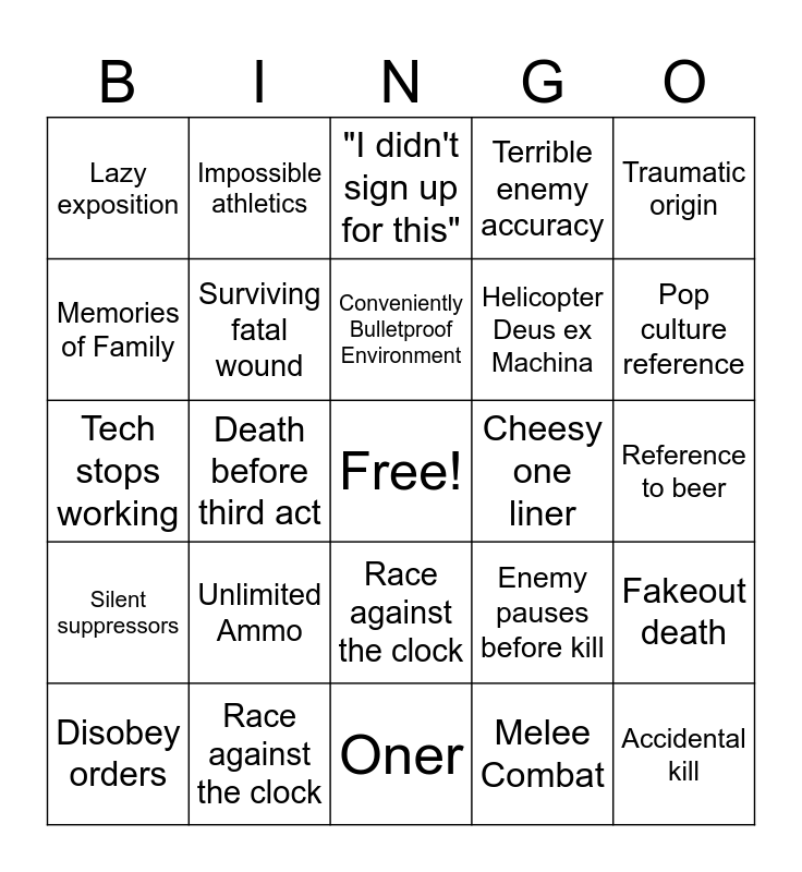 This bingo card has a free space and 28 words: Fakeout death, Heroic sacrifice, Helicopter Deus ex Machina, Melee Combat, Memories of Family, "I didn't sign up for this", Impossible athletics, Silent suppressors, Cheesy one liner, Disobey orders, Tech stops working, Terrible enemy accuracy, Race against the clock, Oner, Pop culture reference, Motivational Speech, Unlimited Ammo, Surviving fatal wound, Conveniently Bulletproof Environment, Race against the clock, Lazy exposition, Car chase, Accidental kill, Death before third act, Reference to beer, Enemy pauses before kill, Traumatic origin and Walking away from explosion.