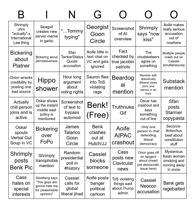 This bingo card has a free space and 48 words: Cass posts new Clavicular news, The chudsketeers agree on something, Aoife posts banger political cartoon, Oskar shows up the instant middle east policy is mentioned, Hour long argument about voting rights, Sfan posts Starmer copypasta, Seagull creates new server meme in gartic, Glowfang says "You guys are gonna hate me for (reasonable opinion)", Shrimply says "now kiss", Benk crashes out at Hutch/JJ, Aoife makes really serious accusation out of nowhere, Georgist Goon Circle, Member with diabolically illiberal views joins and leaves in an hour, Beardog ai mention, Shrimply posts Benk Pic, Oscar has crashout and says something out of line, Bickering about Platner, Multiple people crash out on Cassiel simultaneously, Orion goes off on tangent about (insert pet democratic issue here), Screenshot of AI overview, Fact checked by true jacobin patriots, Screenshot of text to bypass automod, Shrimply uhm "actually"-s International Law thing, Bickering about permissiveness, Mysterious Asian woman smoking and running away in snow, Sfan Tankie/Status Quoite accusation, Substack mention, Cass hates on special interests, Sauron flies into ToS violating rage, Hippo shower, Cassiel Neocon accusation, Truthnuke Gif, Seconre-Antiochus beef about constitution stuff, Shrimply Iranophobia mention, Actually chill person joins and is active, Aoife AIPAC crashout, Only one person in chat defending liberal democracy, Orion wrecks credibility by posting one bad source, James Talarico Goon Circle, Random presidential poll in #history, Oskar spouts Verbal Gut Soup in VC, Benk gets ragebaited, "...Tommy typing", Cassiel calls for global liberal jihad, Aoife little in text chat on VC and gets ignored, Cassiel blocks someone, Bickering over FoPo and ToS violating things said about Trump admin.