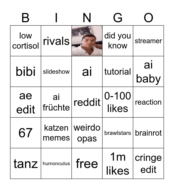 This bingo card has 1 images, a free space and 23 words: katzen memes, humonculus, ai, tanz, streamer, low cortisol, bibi, rivals, 0-100 likes, weirdo opas, tutorial, ae edit, brawlstars, brainrot, slideshow, 1m likes, reaction, ai baby, ai früchte, cringe edit, 67, did you know and free.