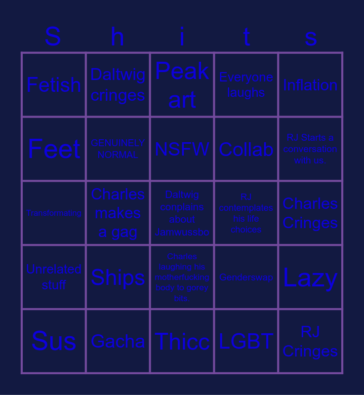 This bingo card has 25 words: Ships, Thicc, NSFW, Sus, Inflation, Fetish, Feet, Daltwig cringes, RJ contemplates his life choices, Charles laughing his motherfucking body to gorey bits., Collab, Transformating, Genderswap, Lazy, GENUINELY NORMAL, RJ Cringes, Charles Cringes, Peak art, RJ Starts a conversation with us., Charles makes a gag, Daltwig conplains about Jamwussbo, Gacha, Unrelated stuff, Everyone laughs and LGBT.