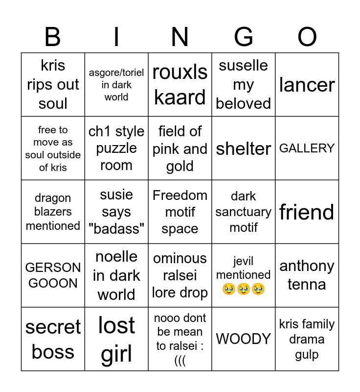 This bingo card has a free space and 24 words: noelle in dark world, lost girl, field of pink and gold, secret boss, lancer, kris rips out soul, free to move as soul outside of kris, asgore/toriel in dark world, dark sanctuary motif, ominous ralsei lore drop, shelter, dragon blazers mentioned, jevil mentioned 🥹🥹🥹, anthony tenna, ch1 style puzzle room, WOODY, friend, rouxls kaard, GALLERY, susie says "badass", kris family drama gulp, GERSON GOOON, suselle my beloved and nooo dont be mean to ralsei :(((.