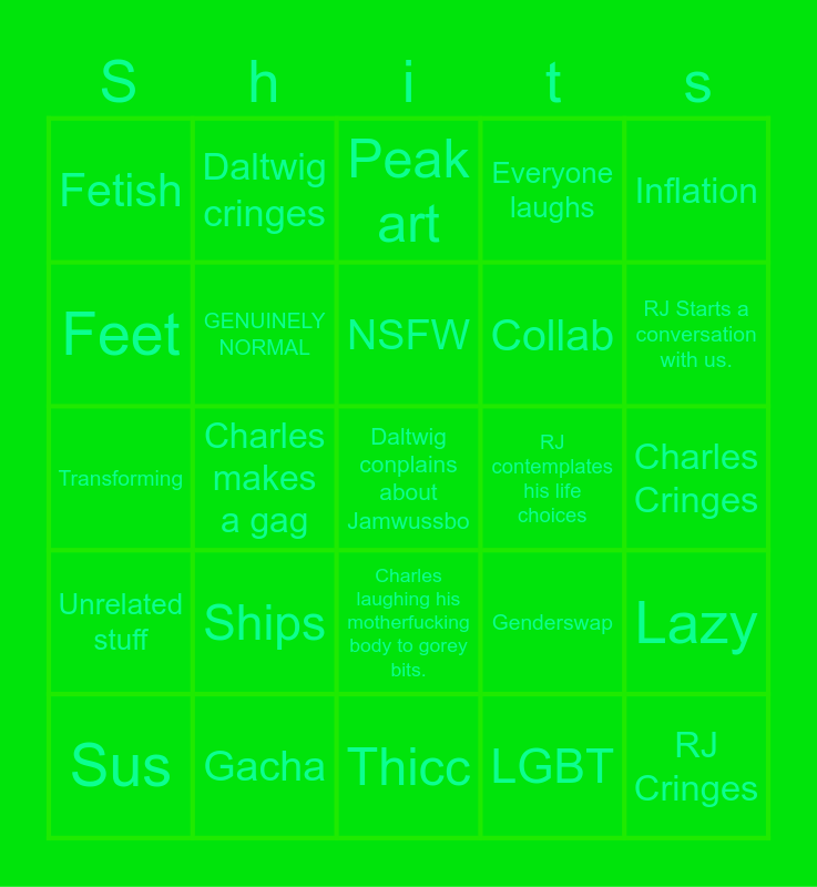This bingo card has 25 words: Ships, Thicc, NSFW, Sus, Inflation, Fetish, Feet, Daltwig cringes, RJ contemplates his life choices, Charles laughing his motherfucking body to gorey bits., Collab, Transforming, Genderswap, Lazy, GENUINELY NORMAL, RJ Cringes, Charles Cringes, Peak art, RJ Starts a conversation with us., Charles makes a gag, Daltwig conplains about Jamwussbo, Gacha, Unrelated stuff, Everyone laughs and LGBT.