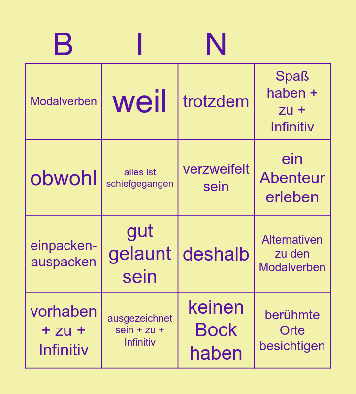 This bingo card has 16 words: vorhaben + zu + Infinitiv, ausgezeichnet sein + zu + Infinitiv, trotzdem, Spaß haben + zu + Infinitiv, obwohl, weil, deshalb, Alternativen zu den Modalverben, Modalverben, alles ist schiefgegangen, keinen Bock haben, ein Abenteur erleben, einpacken-auspacken, gut gelaunt sein, verzweifelt sein and berühmte Orte besichtigen.
