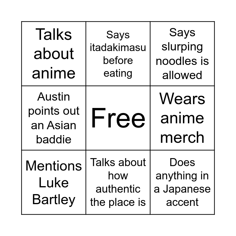 This bingo card has a free space and 8 words: Wears anime merch, Says slurping noodles is allowed, Says itadakimasu before eating, Mentions Luke Bartley, Talks about anime, Does anything in a Japanese accent, Austin points out an Asian baddie and Talks about how authentic the place is.