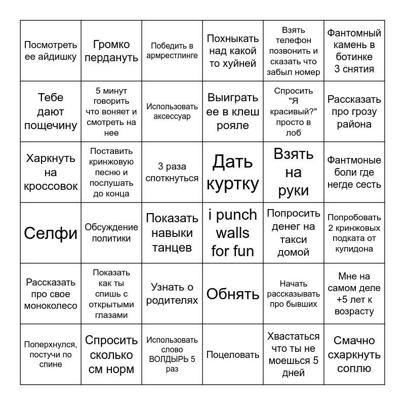 This bingo card has 36 words: Обнять, Узнать о родителях, Поцеловать, Тебе дают пощечину, Селфи, Дать куртку, 5 минут говорить что воняет и смотреть на нее, Использовать слово ВОЛДЫРЬ 5 раз, Взять телефон позвонить и сказать что забыл номер, Начать рассказывать про бывших, Рассказать про грозу района, Похныкать над какой то хуйней, Мне на самом деле +5 лет к возрасту, Поставить кринжовую песню и послушать до конца, Выиграть ее в клеш рояле, Посмотреть ее айдишку, Рассказать про свое моноколесо, Взять на руки, Харкнуть на кроссовок, Победить в армрестлинге, 3 раза споткнуться, Обсуждение политики, i punch walls for fun, Показать навыки танцев, Попросить денег на такси домой, Громко пердануть, Спросить "Я красивый?" просто в лоб, Спросить сколько см норм, Использовать аксессуар, Фантомный камень в ботинке 3 снятия, Смачно схаркнуть соплю, Поперхнулся, постучи по спине, Попробовать 2 кринжовых подката от купидона, Фантмоные боли где негде сесть, Показать как ты спишь с открытыми глазами and Хвастаться что ты не моешься 5 дней.