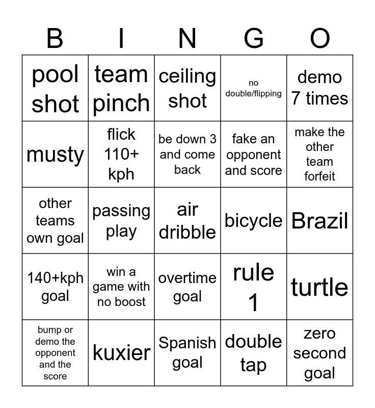 This bingo card has 25 words: 140+kph goal, kuxier, air dribble, double tap, demo 7 times, pool shot, team pinch, ceiling shot, bicycle, turtle, musty, flick 110+ kph, Spanish goal, rule 1, make the other team forfeit, bump or demo the opponent and the score, passing play, be down 3 and come back, fake an opponent and score, Brazil, other teams own goal, win a game with no boost, overtime goal, no double/flipping and zero second goal.
