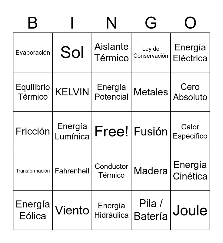 This bingo card has a free space and 37 words: Temperatura, CALOR, CELSIUS, KELVIN, Energía Cinética, Fahrenheit, Energía Potencial, Energía Química, Energía Eléctrica, Energía Mecánica, Energía Lumínica, Ley de Conservación, Joule, Calor Específico, Equilibrio Térmico, Transformación, Energía Solar, Aislante Térmico, Conductor Térmico, Fusión, Evaporación, Cero Absoluto, Energía Eólica, Energía Hidráulica, Calorímetro, Pila / Batería, Sol, Vapor, Hielo, Ebullición, Foco, Viento, Fricción, Comida, Madera, Metales and Fuego.