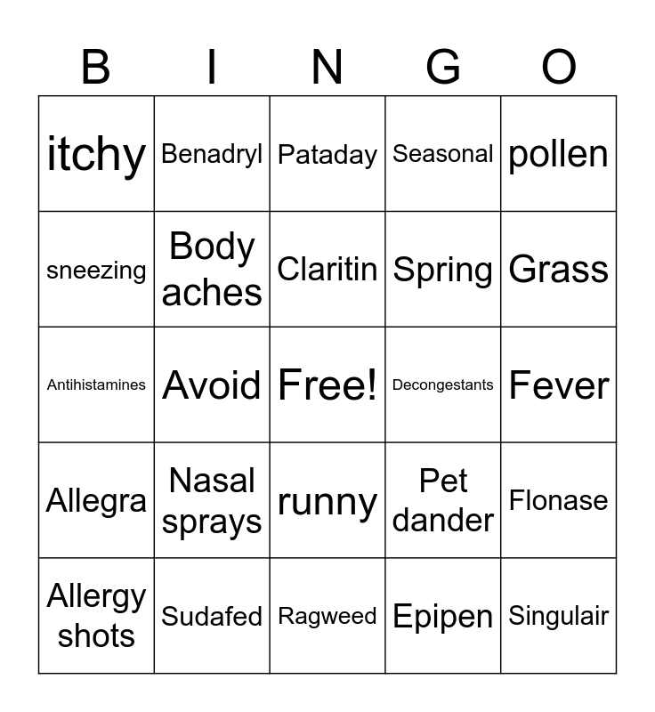 This bingo card has a free space and 26 words: runny, Epipen, Claritin, Sudafed, pollen, itchy, sneezing, Benadryl, Fever, Pet dander, Spring, Antihistamines, Flonase, Allergy shots, Avoid, Cigarette smoke, Seasonal, Allegra, Pataday, Singulair, Grass, Ragweed, Decongestants, Nasal sprays, Body aches and Loss of taste.