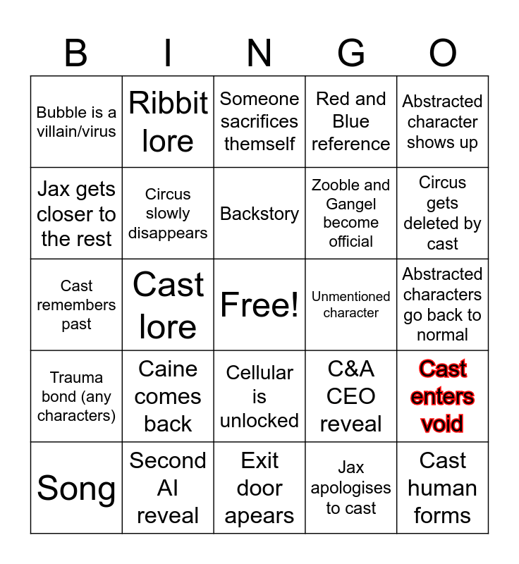 This bingo card has a free space and 24 words: Caine comes back, Second AI reveal, Backstory, Song, Abstracted character shows up, Bubble is a villain/virus, Jax gets closer to the rest, Ribbit lore, Unmentioned character, Cellular is unlocked, Zooble and Gangel become official, Cast remembers past, C&A CEO reveal, Cast enters void, Circus slowly disappears, Jax apologises to cast, Abstracted characters go back to normal, Someone sacrifices themself, Circus gets deleted by cast, Cast lore, Cast human forms, Trauma bond (any characters), Red and Blue reference and Exit door apears.