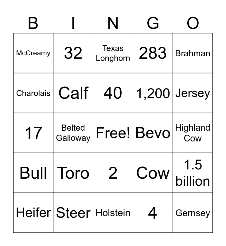 This bingo card has a free space and 29 words: Heifer, Purple Cow, Belted Galloway, Red Angus, McCreamy, Texas Longhorn, Calf, Toro, Bevo, Steer, Highland Cow, Gernsey, Holstein, 4, Jersey, Angus, 2, Bull, Brahman, 17, Cow, 6, 1,200, Charolais, 283, 32, 1.5 billion, 40 and 101.5.
