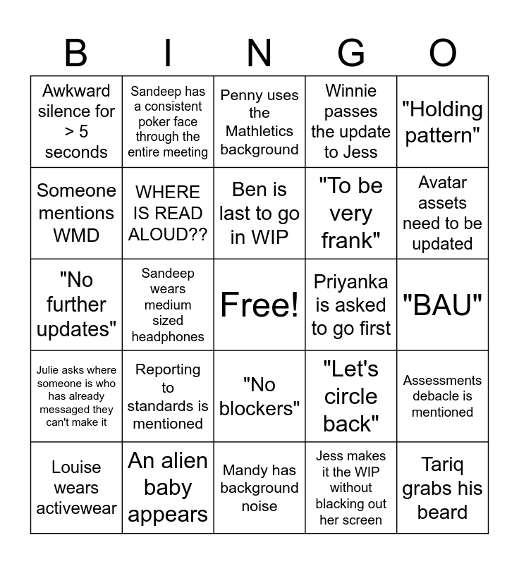 This bingo card has a free space and 24 words: Reporting to standards is mentioned, An alien baby appears, Ben is last to go in WIP, Louise wears activewear, "Holding pattern", Awkward silence for > 5 seconds, Someone mentions WMD, Sandeep has a consistent poker face through the entire meeting, Priyanka is asked to go first, "No blockers", "To be very frank", "No further updates", "Let's circle back", Assessments debacle is mentioned, WHERE IS READ ALOUD??, Jess makes it the WIP without blacking out her screen, "BAU", Penny uses the Mathletics background, Avatar assets need to be updated, Sandeep wears medium sized headphones, Tariq grabs his beard, Julie asks where someone is who has already messaged they can't make it, Winnie passes the update to Jess and Mandy has background noise.