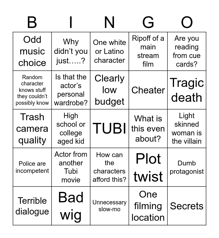 This bingo card has a free space and 24 words: Actor from another Tubi movie, Bad wig, Clearly low budget, Terrible dialogue, Are you reading from cue cards?, Odd music choice, Random character knows stuff they couldn’t possibly know, Why didn’t you just…..?, What is this even about?, How can the characters afford this?, Cheater, Trash camera quality, Plot twist, Dumb protagonist, Is that the actor’s personal wardrobe?, One filming location, Light skinned woman is the villain, One white or Latino character, Tragic death, High school or college aged kid, Secrets, Police are incompetent, Ripoff of a main stream film and Unnecessary slow-mo.