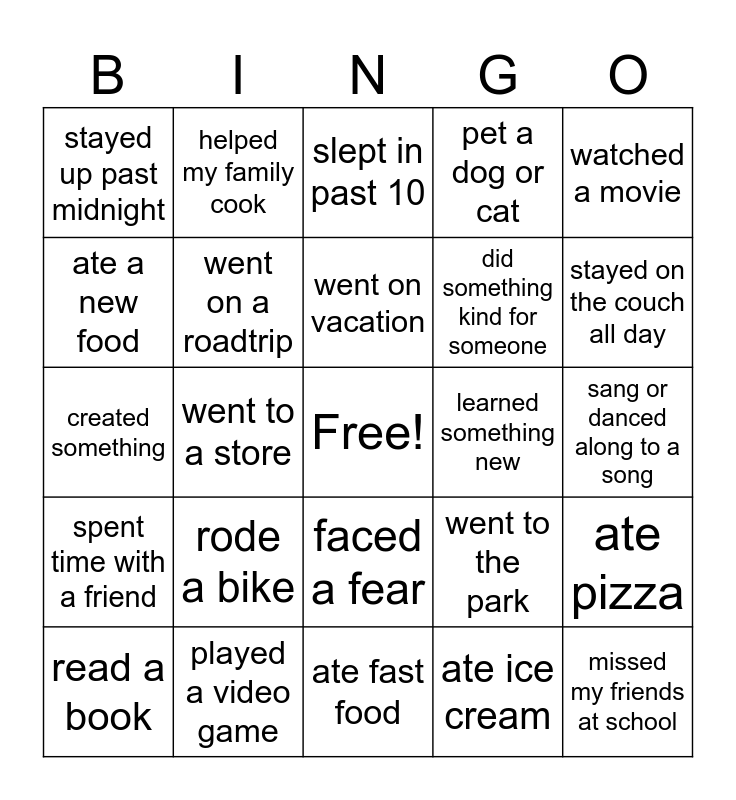 This bingo card has a free space and 24 words: rode a bike, played a video game, went on vacation, read a book, watched a movie, stayed up past midnight, ate a new food, helped my family cook, learned something new, faced a fear, did something kind for someone, created something, went to the park, ate pizza, went on a roadtrip, ate ice cream, sang or danced along to a song, slept in past 10, stayed on the couch all day, went to a store, missed my friends at school, spent time with a friend, pet a dog or cat and ate fast food.