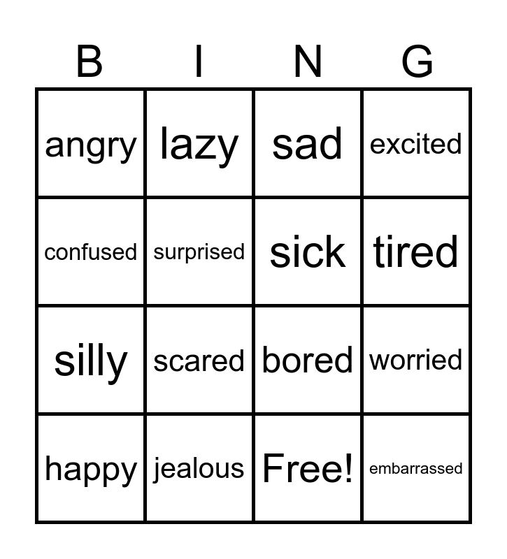 This bingo card has 17 words: Free!, happy, sad, angry, scared, excited, worried, sick, tired, surprised, jealous, bored, confused, lazy, silly, shy and embarrassed.