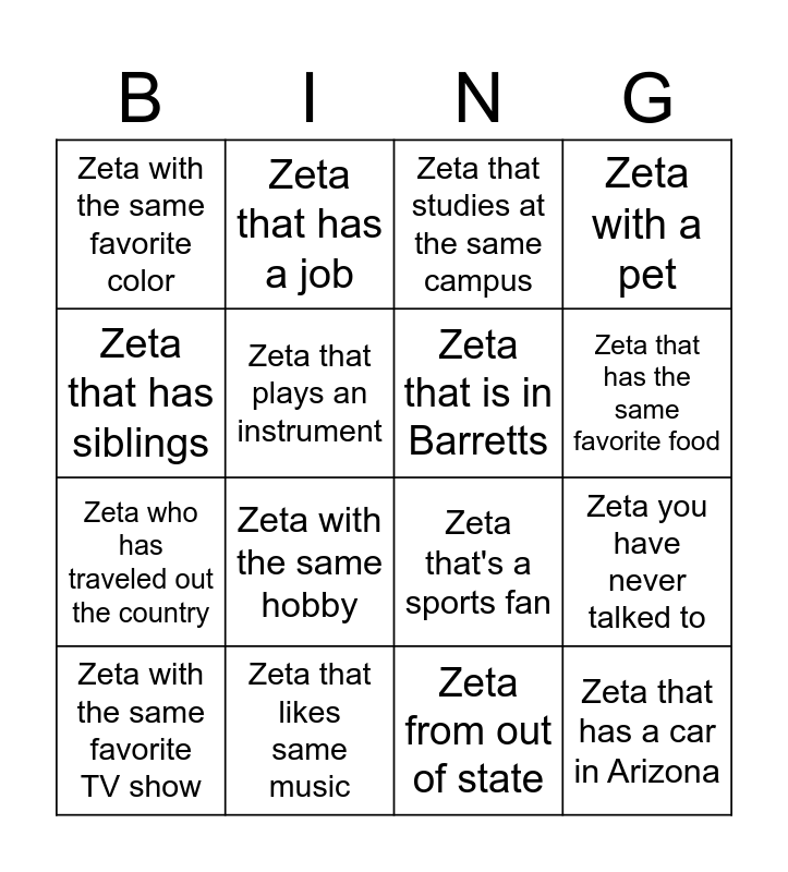 This bingo card has 16 words: Zeta that likes same music, Zeta you have never talked to, Zeta that studies at the same campus, Zeta with the same favorite color, Zeta who has traveled out the country, Zeta that has a job, Zeta that's a sports fan, Zeta from out of state, Zeta that has siblings, Zeta that plays an instrument, Zeta with the same favorite TV show, Zeta with a pet, Zeta with the same hobby, Zeta that has the same favorite food, Zeta that is in Barretts and Zeta that has a car in Arizona.