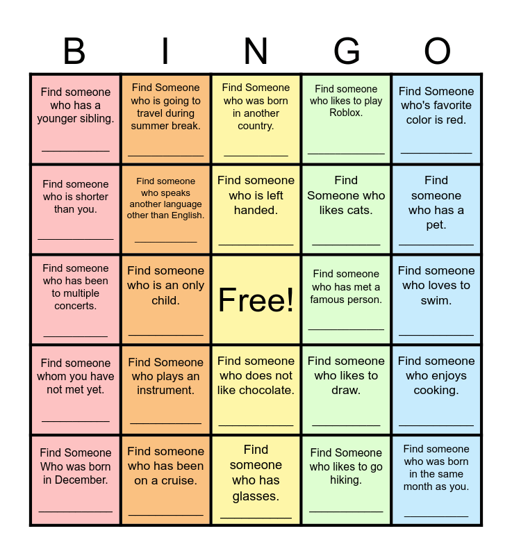 This bingo card has a free space and 25 words: Find Someone Who was born in December. ____________, Find Someone who plays an instrument. ___________, Find someone who is left handed. ___________, Find Someone who likes to go hiking. ____________, Find someone who has a pet. ___________, Find someone who has a younger sibling. ___________, Find Someone who is going to travel during summer break. _____________, Find Someone who was born in another country. ___________, Find Someone who likes cats. __________, Find someone who enjoys cooking. ___________, Find someone who has been to multiple concerts. ___________, Find someone who speaks another language other than English. ____________, Find someone who likes to draw. __________, Find someone who was born in the same month as you. ___________, Find someone who is shorter than you. _____________, Find someone who has been on a cruise. ___________, Find someone who has glasses. __________, Find someone who likes to play Roblox. ______________, Find someone who loves to swim. ___________, Find someone whom you have not met yet. ___________, Find someone who is an only child. ___________, Find someone who does not like chocolate. ___________, Find someone who has met a famous person. _____________, Find Someone who's favorite color is red. ___________ and Find someone who is wearing a blue shirt. ____________.