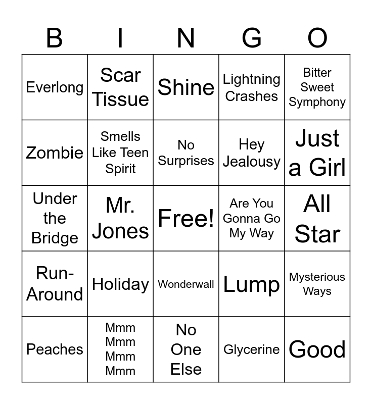 This bingo card has a free space and 35 words: Island In the Sun, Say It Ain't So, Buddy Holly, Smells Like Teen Spirit, Wonderwall, Lightning Crashes, Zombie, Linger, No Surprises, Basket Case, Under the Bridge, Bitter Sweet Symphony, Spiderwebs, All the Small Things, Everlong, Are You Gonna Go My Way, Glycerine, Mr. Jones, Run-Around, Good, Lump, Peaches, Mysterious Ways, Mmm Mmm Mmm Mmm, Shine, Just a Girl, Crash Into Me, Santa Monica, Hey Jealousy, All Star, Undone - The Sweater Song, No One Else, Holiday, Scar Tissue and The Bug.