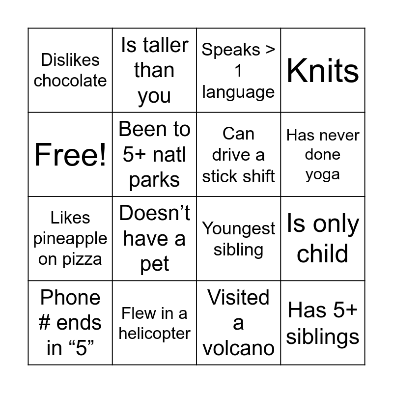 This bingo card has 41 words: Has brown eyes, Youngest sibling, Plays pickleball, Can drive a stick shift, Doesn’t drink soda, Has been to Maine, Has never done yoga, Middle child, Free!, Has 5+ siblings, Is only child, Knits, Phone # ends in “5”, Visited a volcano, Flew in a helicopter, Likes bird watching, Been to Africa, Dislikes chocolate, Never got a speeding ticket, Speaks > 1 language, Plays cribbage, Owns a sports car, Likes sardines, Likes pineapple on pizza, Has driven a car > 100mph, Lived in a foreign country, Been to Iceland, Birthday this month, Doesn’t have a pet, Oldest child, Has coached a sport, Is taller than you, Dislikes coffee, Doesn’t live in Sun Lakes, Has been skydiving, Been to 5+ natl parks, Has never been to the Masters, Grew up in Nebraska, Birthday in July, Has never had surgery and Plays a musical instrument.