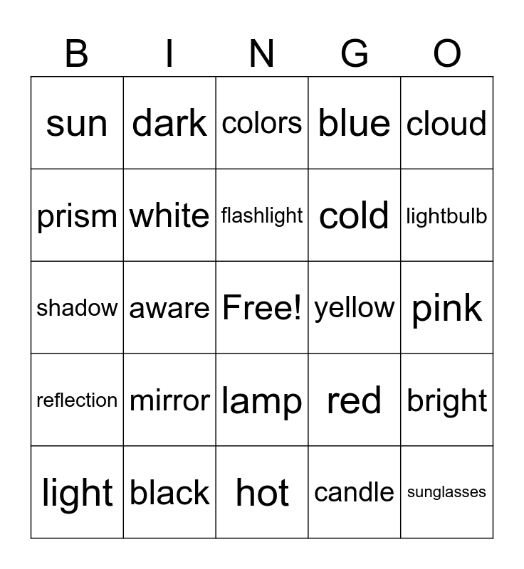 This bingo card has a free space and 24 words: light, mirror, flashlight, candle, cloud, sun, dark, colors, yellow, pink, shadow, white, red, bright, prism, black, hot, blue, lightbulb, reflection, aware, lamp, cold and sunglasses.