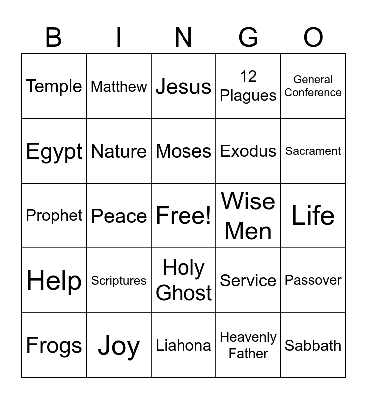 This bingo card has a free space and 30 words: Joy, Love, Peace, Church, Temple, Jesus, Nature, Holy Ghost, Wise Men, Liahona, Life, Sabbath, Heavenly Father, Heaven, Sacrament, Otter, Service, Help, Scriptures, General Conference, Prophet, Prayer, Matthew, Exodus, Egypt, 12 Plagues, Passover, Frogs, Moses and Jacob.