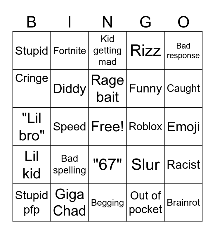 This bingo card has a free space and 24 words: Bad spelling, Giga Chad, Rage bait, Stupid pfp, Bad response, Stupid, Cringe, Fortnite, Roblox, "67", Funny, "Lil bro", Slur, Racist, Diddy, Out of pocket, Emoji, Kid getting mad, Caught, Speed, Brainrot, Lil kid, Rizz and Begging.