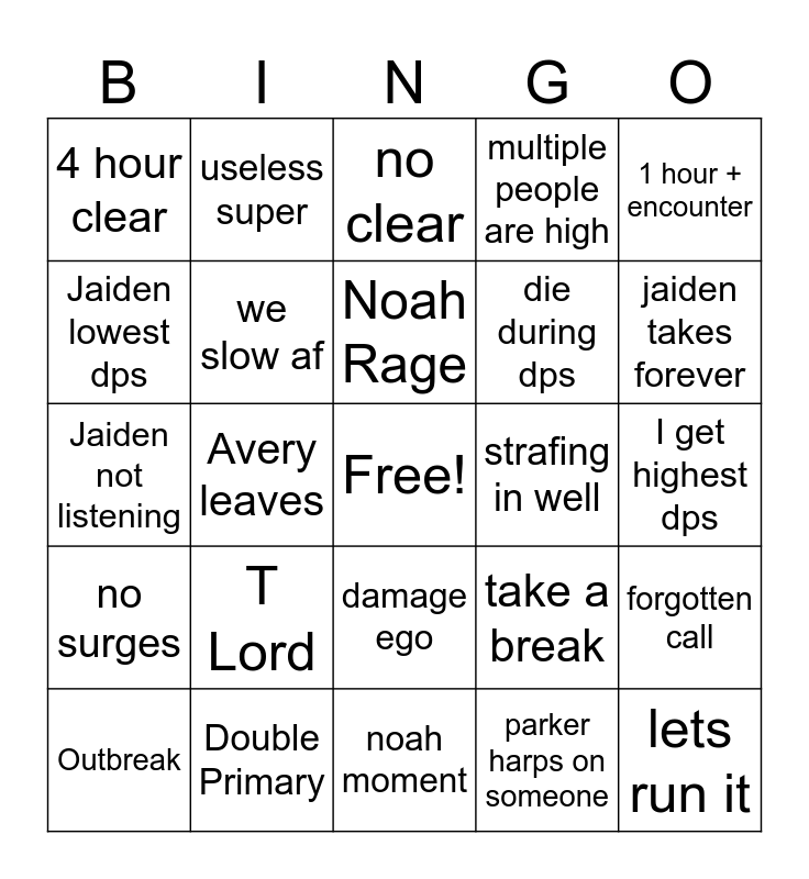 This bingo card has a free space and 24 words: T Lord, Double Primary, Noah Rage, Outbreak, 1 hour + encounter, 4 hour clear, Jaiden lowest dps, useless super, strafing in well, damage ego, die during dps, Jaiden not listening, take a break, forgotten call, we slow af, parker harps on someone, I get highest dps, no clear, jaiden takes forever, Avery leaves, lets run it, no surges, multiple people are high and noah moment.