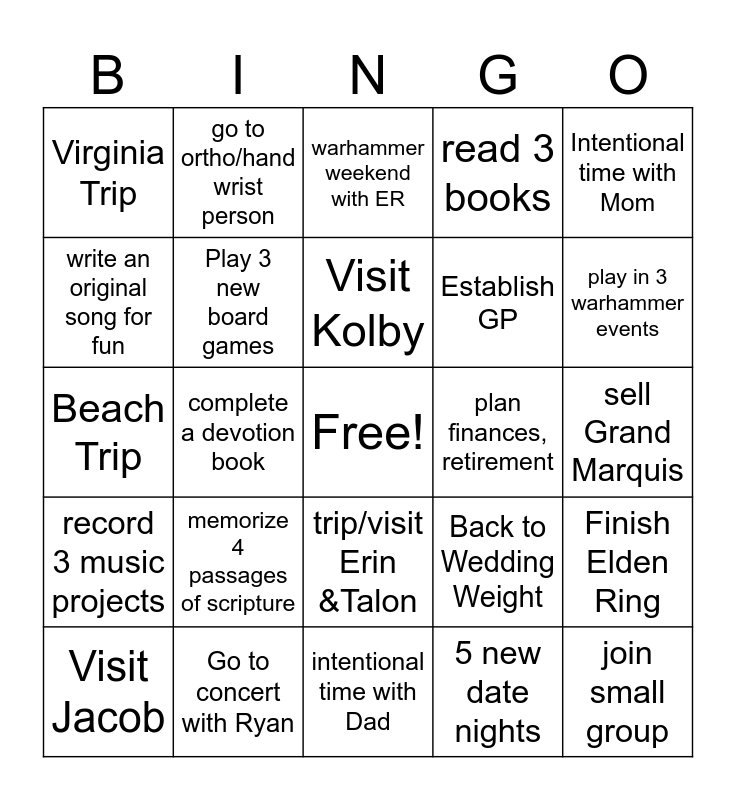 This bingo card has a free space and 24 words: memorize 4 passages of scripture, Go to concert with Ryan, Visit Kolby, Visit Jacob, Intentional time with Mom, Virginia Trip, write an original song for fun, go to ortho/hand wrist person, plan finances, retirement, trip/visit Erin &Talon, Establish GP, Beach Trip, Back to Wedding Weight, Finish Elden Ring, Play 3 new board games, 5 new date nights, sell Grand Marquis, warhammer weekend with ER, play in 3 warhammer events, complete a devotion book, join small group, record 3 music projects, read 3 books and intentional time with Dad.