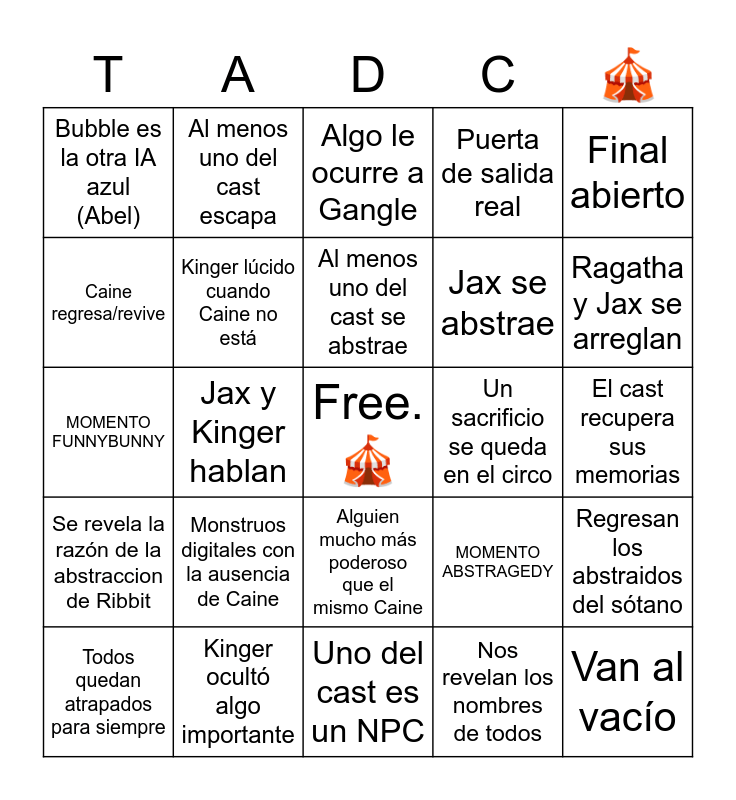 This bingo card has a free space and 24 words: Monstruos digitales con la ausencia de Caine, Kinger ocultó algo importante, Al menos uno del cast se abstrae, Todos quedan atrapados para siempre, Final abierto, Bubble es la otra IA azul (Abel), Caine regresa/revive, Al menos uno del cast escapa, Un sacrificio se queda en el circo, Alguien mucho más poderoso que el mismo Caine, Jax se abstrae, MOMENTO FUNNYBUNNY, MOMENTO ABSTRAGEDY, Regresan los abstraidos del sótano, Kinger lúcido cuando Caine no está, Nos revelan los nombres de todos, El cast recupera sus memorias, Algo le ocurre a Gangle, Ragatha y Jax se arreglan, Jax y Kinger hablan, Van al vacío, Se revela la razón de la abstraccion de Ribbit, Puerta de salida real and Uno del cast es un NPC.