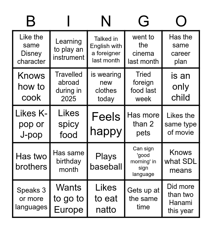 This bingo card has 25 words: Has same birthday month, Likes to eat natto, is wearing new clothes today, Speaks 3 or more languages, Has the same career plan, Like the same Disney character, Knows how to cook, Learning to play an instrument, Has more than 2 pets, Plays baseball, Tried foreign food last week, Likes K-pop or J-pop, Can sign 'good morning' in sign language, Knows what SDL means, Travelled abroad during in 2025, Did more than two Hanami this year, Likes the same type of movie, Talked in English with a foreigner last month, is an only child, Likes spicy food, Feels happy, Wants to go to Europe, Has two brothers, went to the cinema last month and Gets up at the same time.