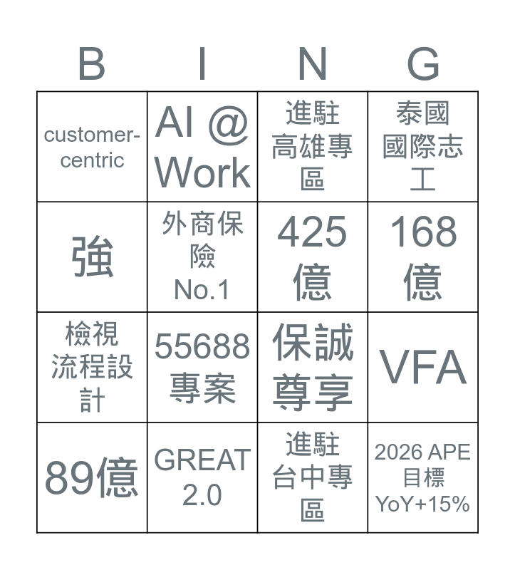 This bingo card has 20 words: VFA, 超10億APE, 進駐 高雄專區, 高資產客群, 89億, 強, GREAT 2.0, customer-centric, 檢視 流程設計, AI @ Work, 55688 專案, 保誠 尊享, 外商保險 No.1, 2026 APE目標 YoY+15%, 425億, 越南 國際志工, 168億, 泰國 國際志工, 進駐 台中專區 and 2026 APE目標 YoY+25%.