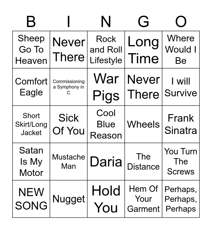 This bingo card has 25 words: Mustache Man, Hold You, War Pigs, NEW SONG, Where Would I Be, Sheep Go To Heaven, Comfort Eagle, Never There, Wheels, Daria, Never There, Short Skirt/Long Jacket, The Distance, You Turn The Screws, Commissioning a Symphony in C, Perhaps, Perhaps, Perhaps, Frank Sinatra, Rock and Roll Lifestyle, I will Survive, Sick Of You, Cool Blue Reason, Nugget, Satan Is My Motor, Long Time and Hem Of Your Garment.