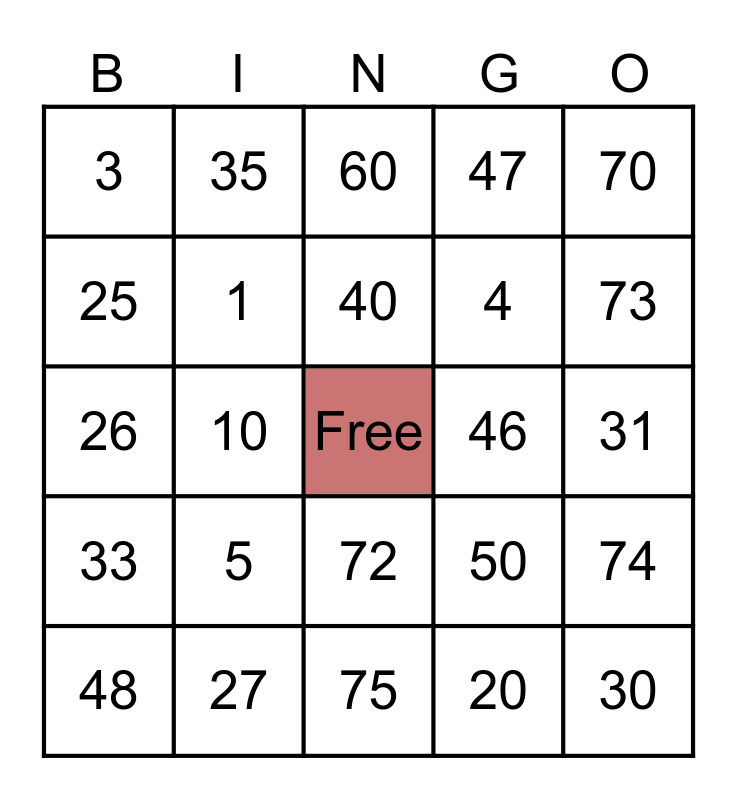 This bingo card has a free space and 24 words: 5, 27, 40, 48, 70, 3, 25, 35, 46, 72, 4, 26, 50, 74, 1, 20, 31, 60, 73, 10, 30, 33, 47 and 75.