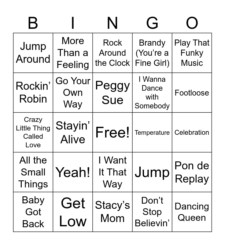 This bingo card has a free space and 75 words: Johnny B. Goode, Tutti Frutti, Rock Around the Clock, That’ll Be the Day, La Bamba, Blue Suede Shoes, Ain’t That a Shame, Splish Splash, Yakety Yak, Be-Bop-A-Lula, Why Do Fools Fall in Love, Come Go with Me, Peggy Sue, Rockin’ Robin, Get a Job, Stayin’ Alive, September, Dancing Queen, Le Freak, Play That Funky Music, Sir Duke, Crazy Little Thing Called Love, Go Your Own Way, More Than a Feeling, Brandy (You’re a Fine Girl), Lookin’ Out My Back Door, Sweet Home Alabama, You Sexy Thing, Shake Your Groove Thing, American Band, Billie Jean, Girls Just Want to Have Fun, Take On Me, Jump, Footloose, I Wanna Dance with Somebody, Walk This Way, Push It, Celebration, Don’t Stop Believin’, Walking on Sunshine, Super Freak, Whip It, Addicted to Love, Love Shack, Wannabe, Baby Got Back, Jump Around, MMMBop, All Star, No Scrubs, I Want It That Way, Barbie Girl, U Can’t Touch This, This Is How We Do It, Good Vibrations, Tubthumping, Semi-Charmed Life, Gonna Make You Sweat, Jump, Yeah!, Hey Ya!, Since U Been Gone, Mr. Brightside, Low, Temperature, Gold Digger, Party in the U.S.A., I Gotta Feeling, Pon de Replay, All the Small Things, Get Low, Crazy, Stacy’s Mom and Sugar, We’re Goin Down.