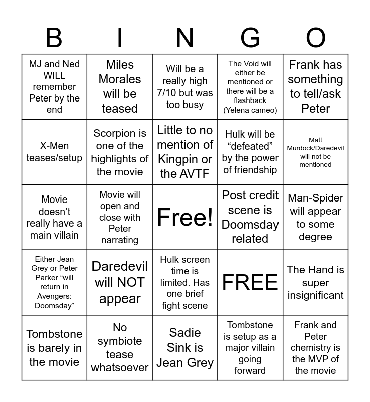This bingo card has a free space and 25 words: Daredevil will NOT appear, Sadie Sink is Jean Grey, Little to no mention of Kingpin or the AVTF, Tombstone is barely in the movie, Frank has something to tell/ask Peter, MJ and Ned WILL remember Peter by the end, X-Men teases/setup, Miles Morales will be teased, Post credit scene is Doomsday related, Hulk screen time is limited. Has one brief fight scene, Hulk will be “defeated” by the power of friendship, Movie doesn’t really have a main villain, FREE, The Hand is super insignificant, Scorpion is one of the highlights of the movie, Scorpion is under-utilized, Man-Spider will appear to some degree, Will be a really high 7/10 but was too busy, Matt Murdock/Daredevil will not be mentioned, Movie will open and close with Peter narrating, Frank and Peter chemistry is the MVP of the movie, No symbiote tease whatsoever, Either Jean Grey or Peter Parker “will return in Avengers: Doomsday”, The Void will either be mentioned or there will be a flashback (Yelena cameo) and Tombstone is setup as a major villain going forward.