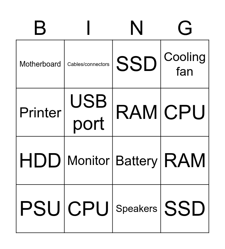 This bingo card has 16 words: CPU, RAM, SSD, Motherboard, HDD, Cables/connectors, Battery, Speakers, Printer, USB port, PSU, Cooling fan, Monitor, CPU, RAM and SSD.